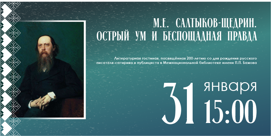 31 января в 15:00 приглашаем вас на литературную программу, посвященную 200-летию со дня рождения великого русского сатирика и публициста Михаила Евграфовича Салтыкова-Щедрина.