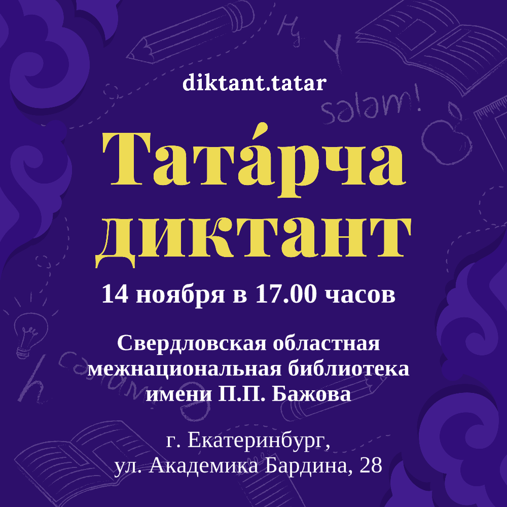 Приглашаем 14 ноября 2025 года в 17.00 часов присоединиться к Всемирной образовательной акции «Татарча диктант» («Татарский диктант») на площадке Свердловской областной межнациональной библиотеки имени П.П. Бажова!