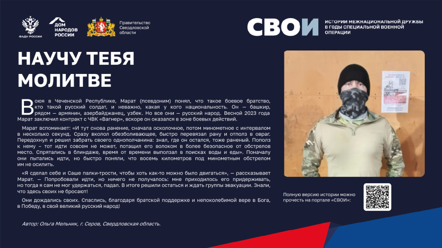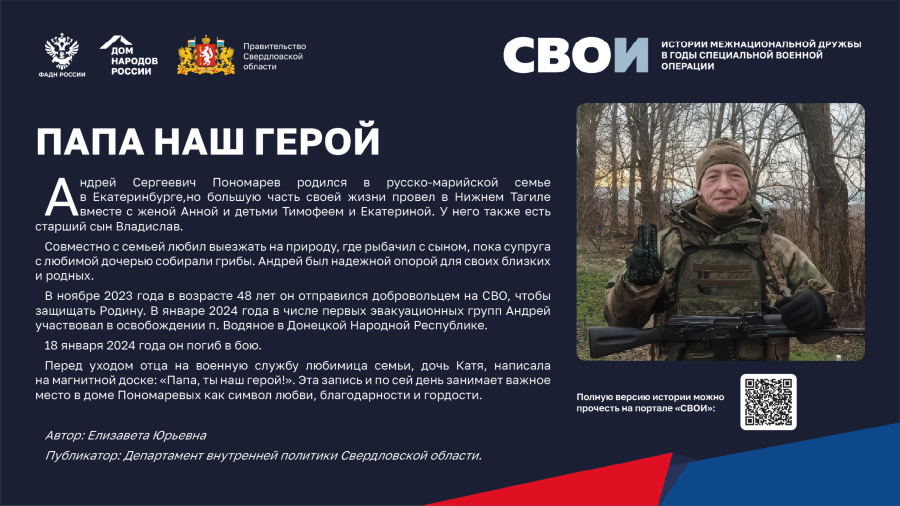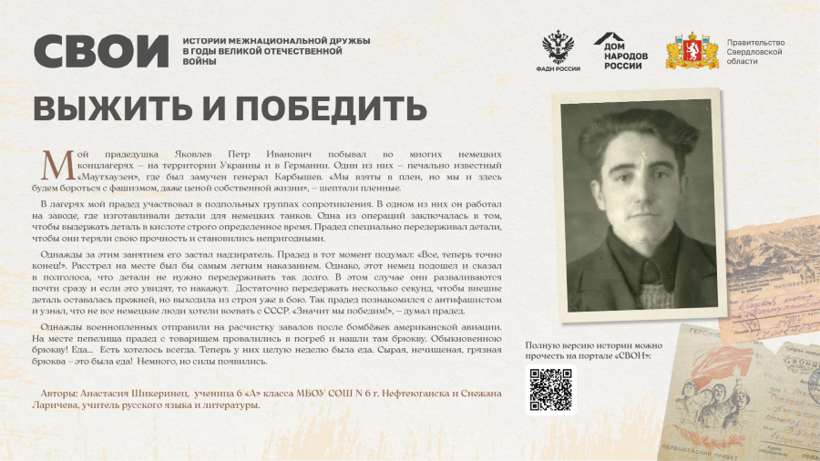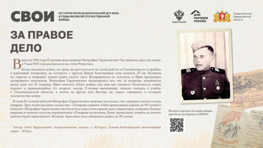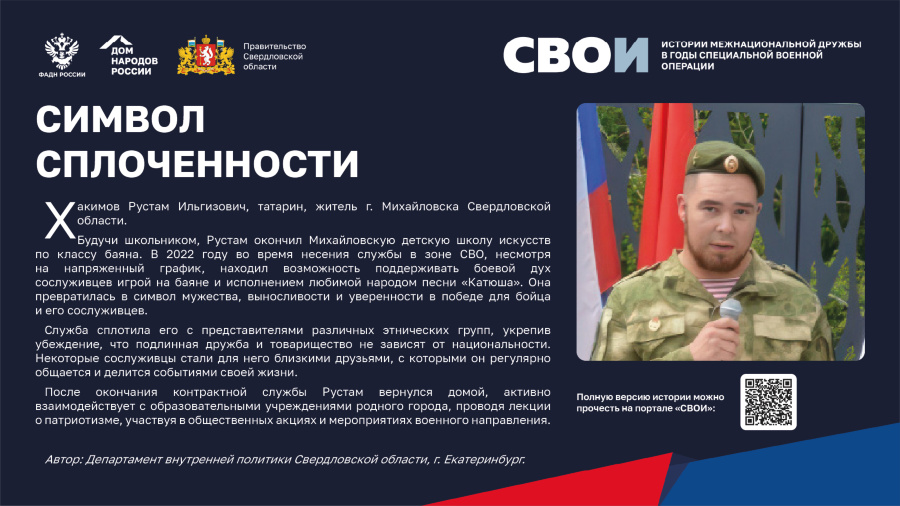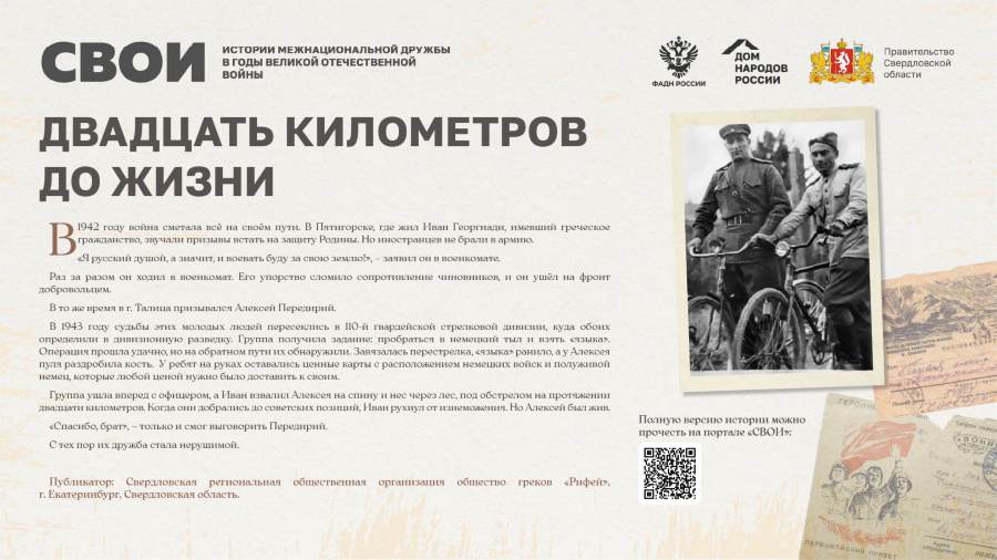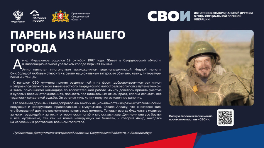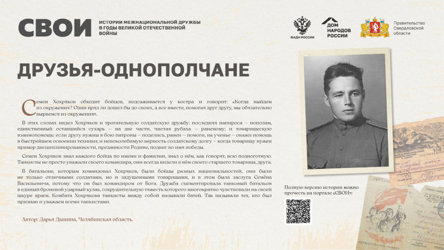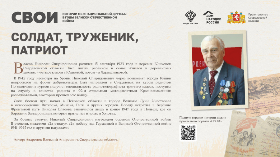 Департаментом внутренней политики Свердловской области во взаимодействии с ФБУ «Дом народов России» создана межрегиональная патриотическая выставка «СВОИ» (далее – выставка), в которую вошли 20 историй о героях Великой Отечественной войны и специальной военной операции.