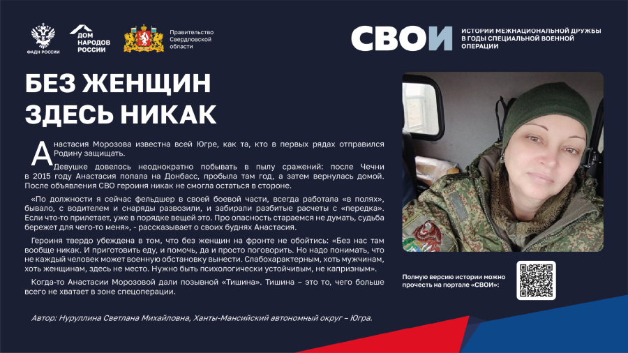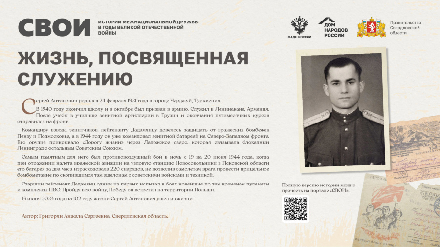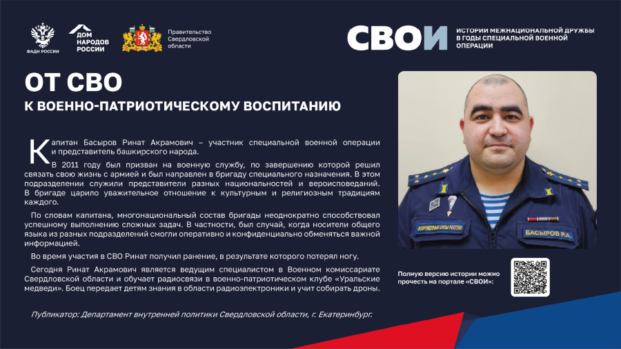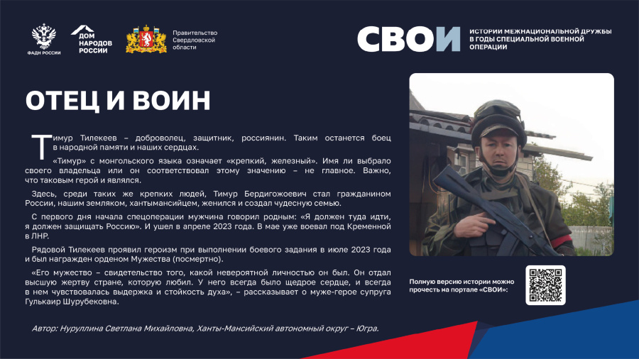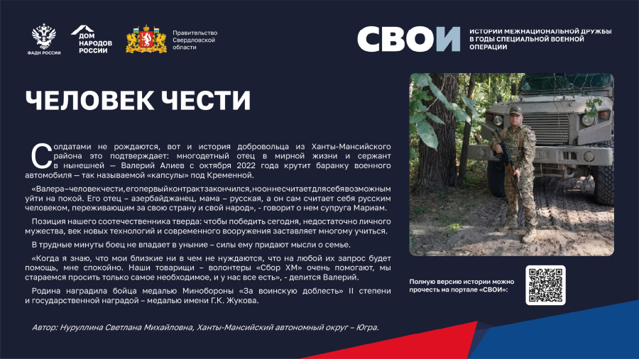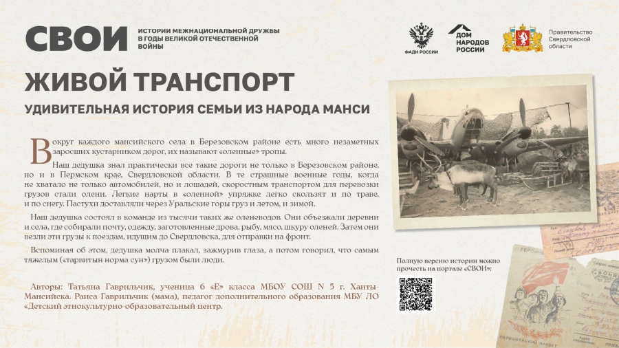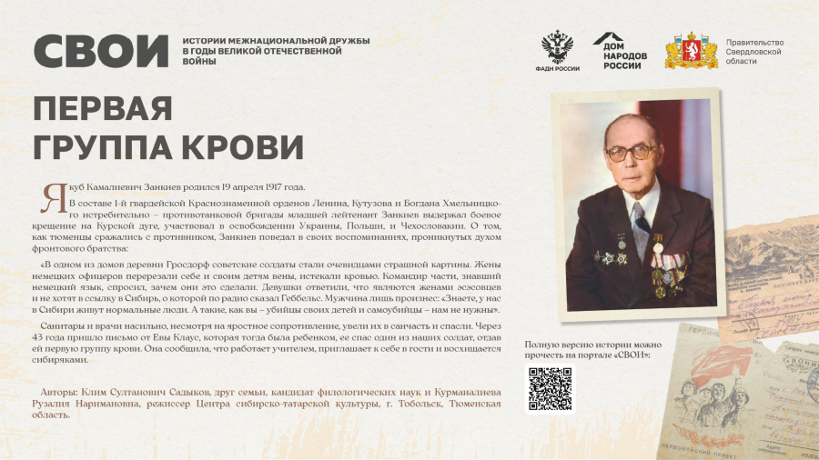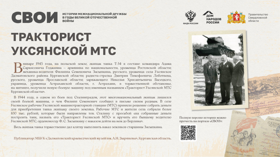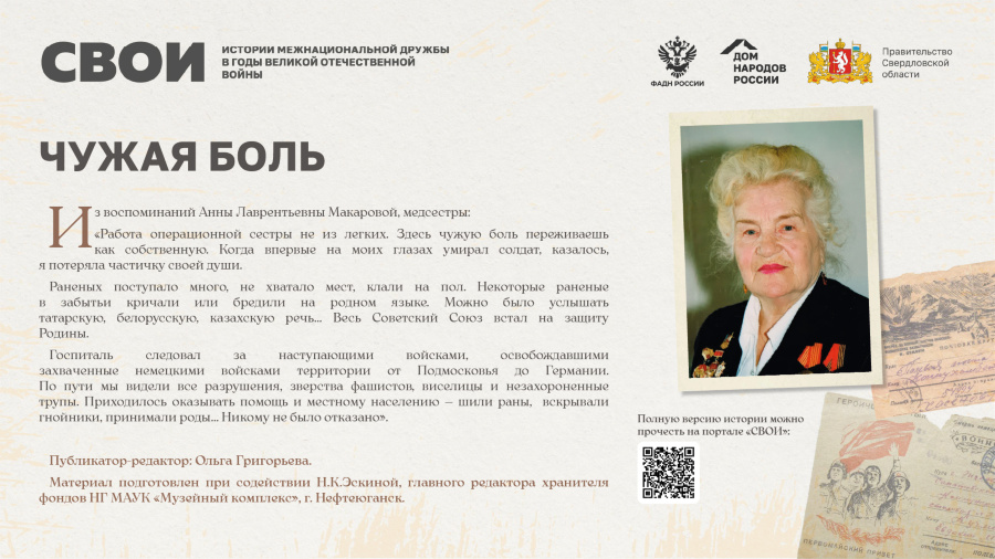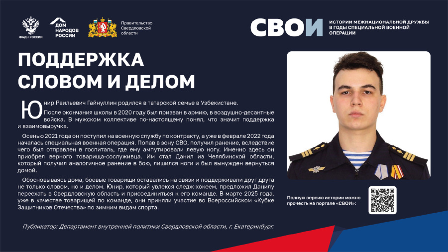 Департаментом внутренней политики Свердловской области во взаимодействии с ФБУ «Дом народов России» создана межрегиональная патриотическая выставка «СВОИ» (далее – выставка), в которую вошли 20 историй о героях Великой Отечественной войны и специальной военной операции.