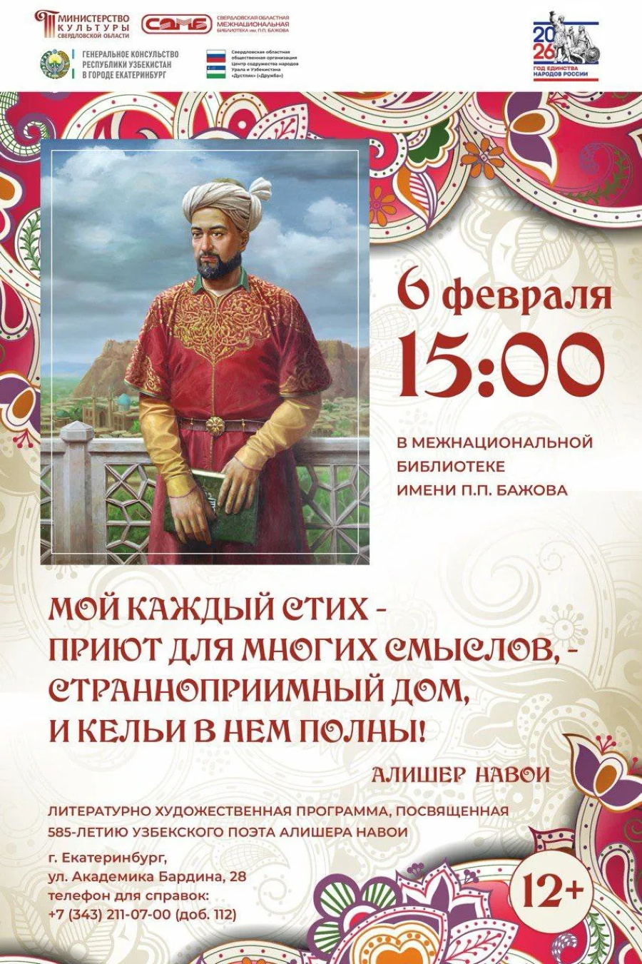 6 февраля в 15:00 в Межнациональной библиотеке имени П.П. Бажова состоится вечер «Мой каждый стих – приют для многих смыслов, - странноприимный дом, и кельи в нем полны!». Мероприятие приурочено к 585-летию выдающегося поэта, философа, мыслителя и основоположника узбекского литературного языка.