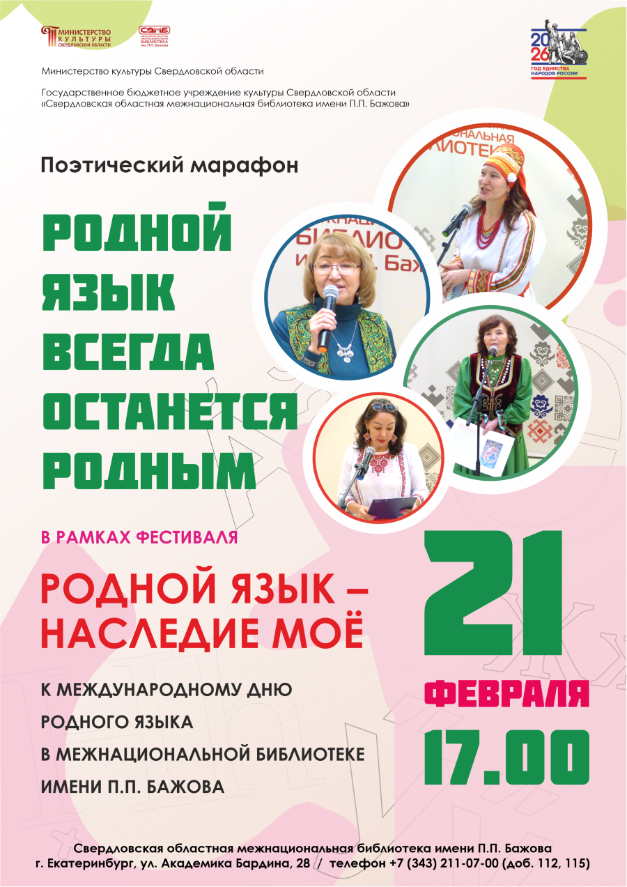 Свердловская областная межнациональная библиотека имени П.П. Бажова при поддержке Министерства культуры Свердловской области проводит 21 февраля 2026 года в 17.00 проводит Поэтический марафон «Родной язык всегда останется родным» к Международному дню родного языка.