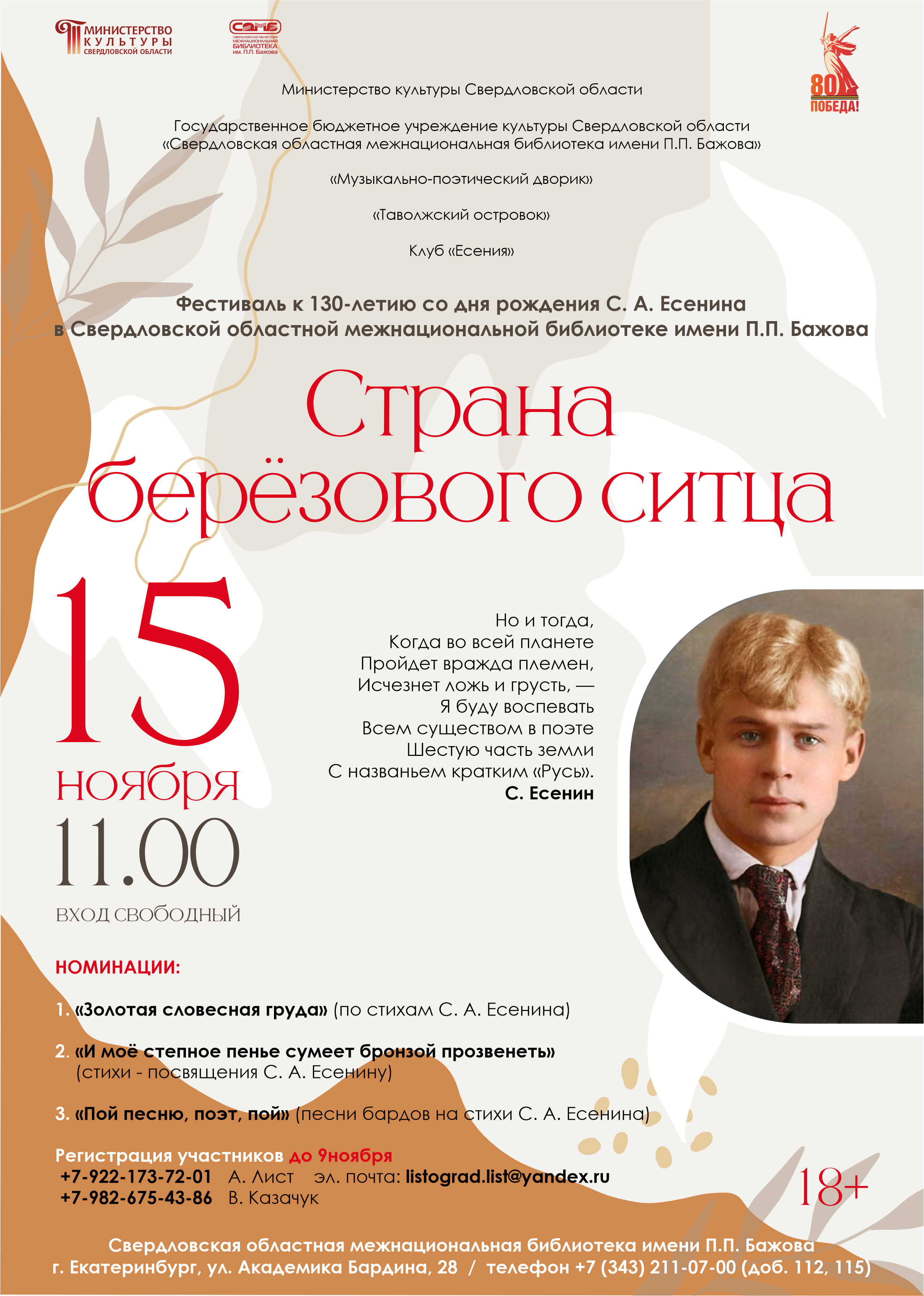 Межнациональная библиотека имени П. П. Бажова и Клуб «Есения» с радостью приглашают вас на литературно-музыкально-поэтический фестиваль «Страна берёзового ситца», посвящённый 130-летию великого русского поэта Сергея Александровича Есенина!