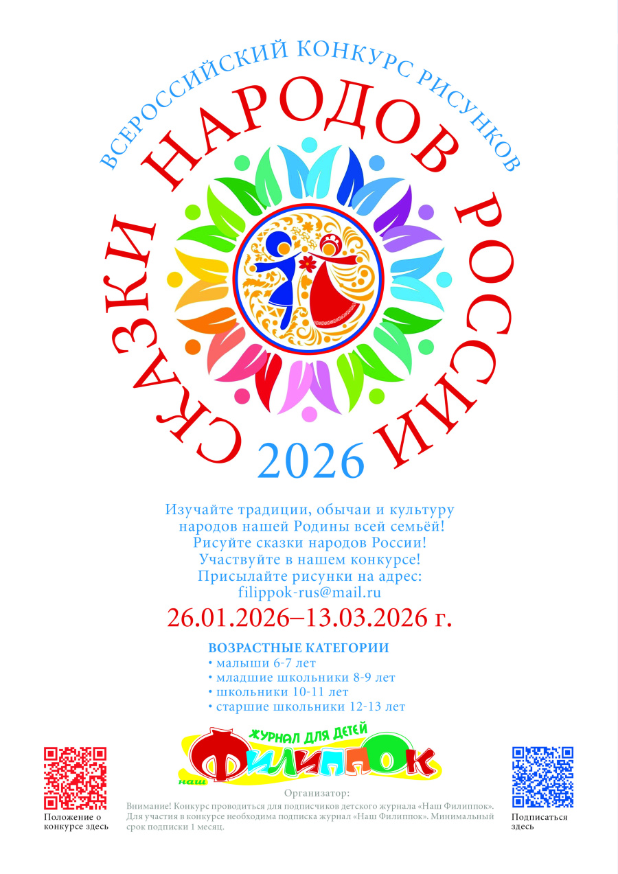 Редакция детского журнала «Наш Филиппок» объявляет о старте конкурса рисунков «Сказки народов России» для детей от 6 до 13 лет. Участникам предлагается создать иллюстрацию к одной из сказок народов России в любой художественной технике. Работы принимаются с 26 января по 6 марта 2026 года, а имена победителей будут объявлены 13 марта на официальной странице журнала в социальной сети VK.