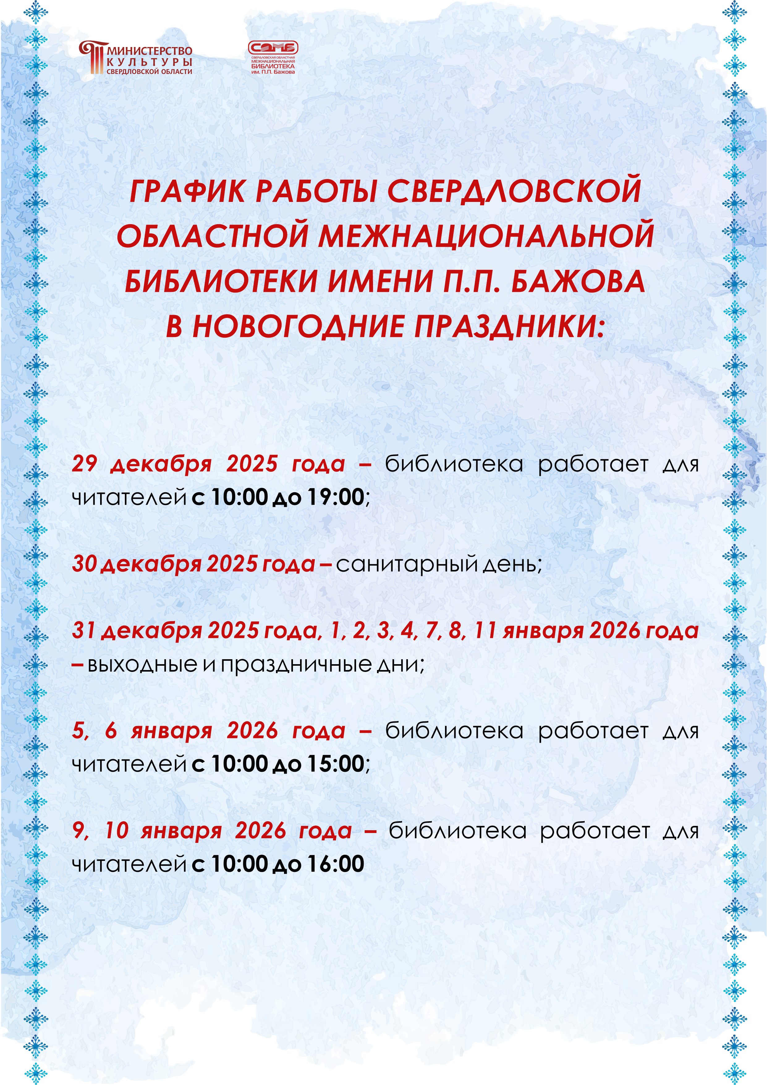 В связи с приближающимися Новогодними праздниками, обращаем ваше внимание на изменение режима работы нашей библиотеки.