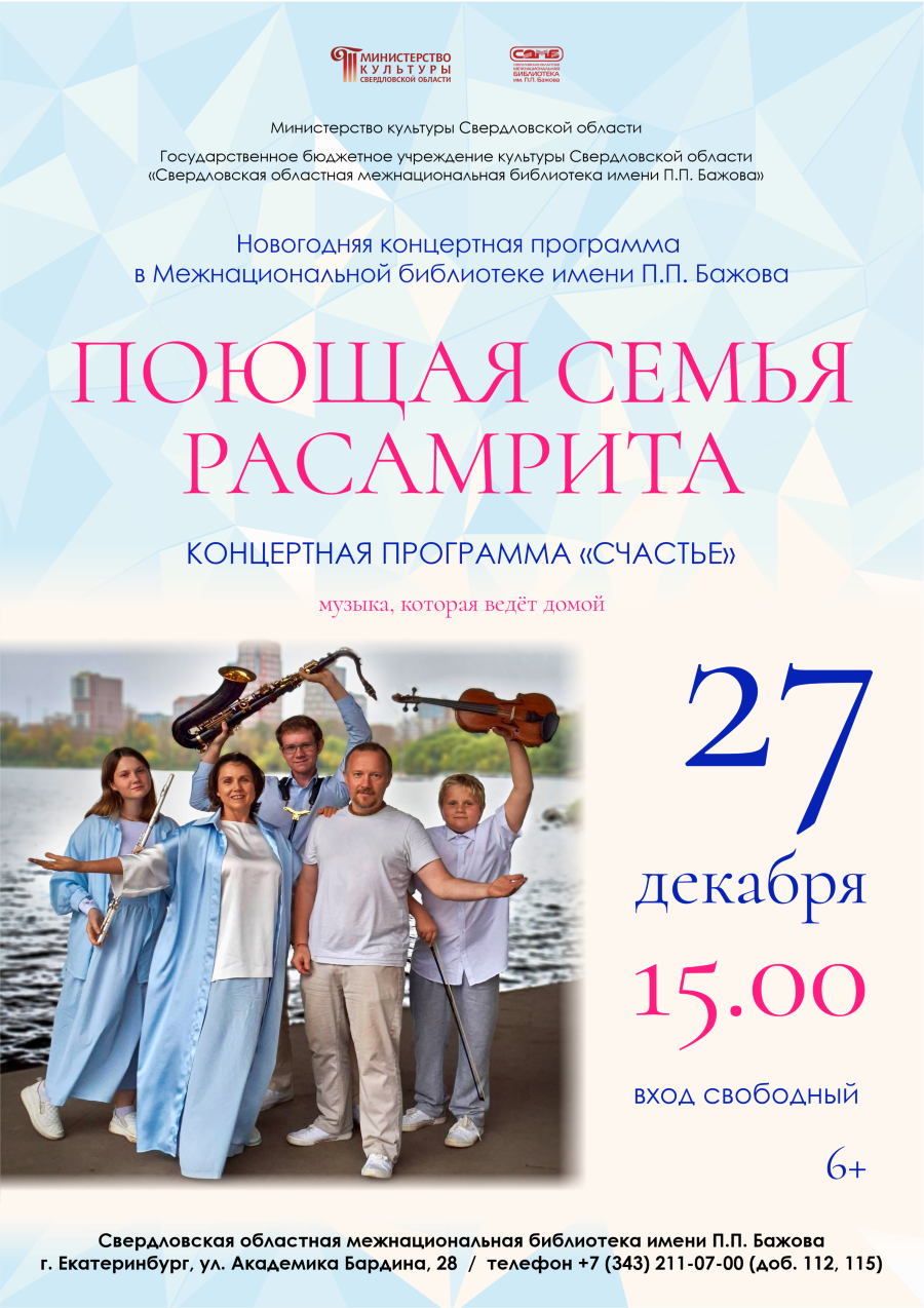27 декабря в 15:00 на сцене Межнациональной библиотеки имени П.П. Бажова состоится уникальный концерт семейной группы «Расамрита».