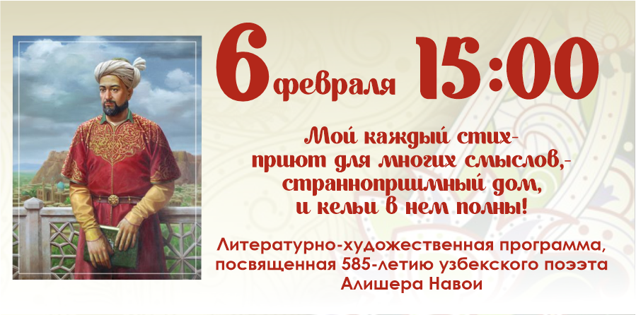 6 февраля в 15:00 в Межнациональной библиотеке имени П.П. Бажова состоится вечер «Мой каждый стих – приют для многих смыслов, - странноприимный дом, и кельи в нем полны!». Мероприятие приурочено к 585-летию выдающегося поэта, философа, мыслителя и основоположника узбекского литературного языка.