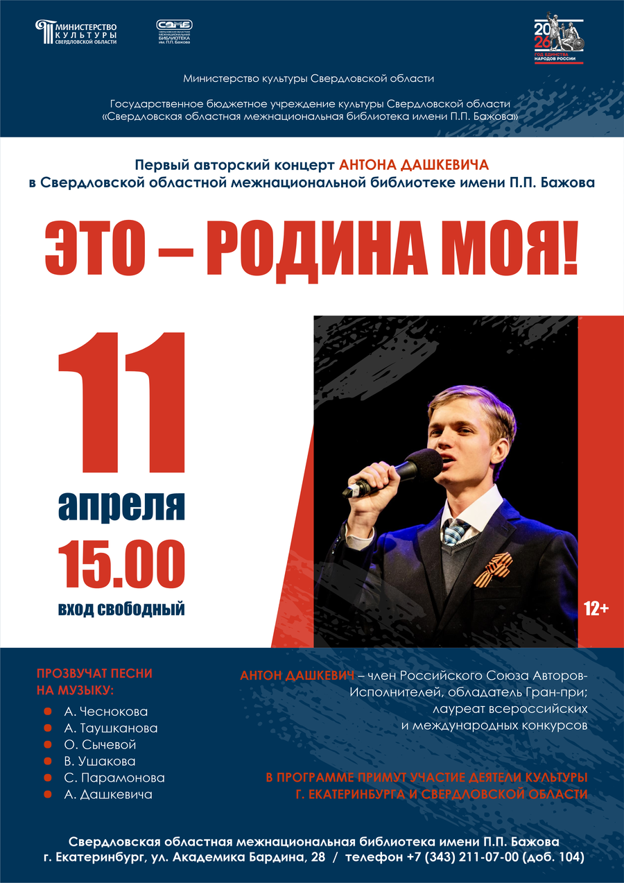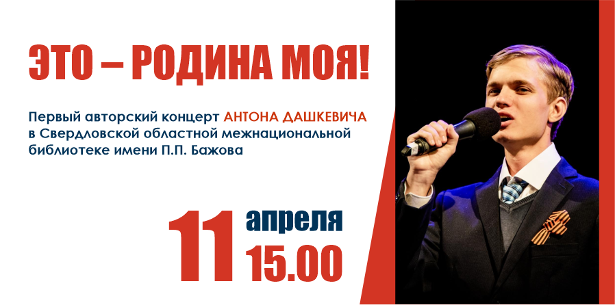 11 апреля в Свердловской областной межнациональной библиотеке имени П.П. Бажова состоится первый авторский концерт Антона Дашкевича.