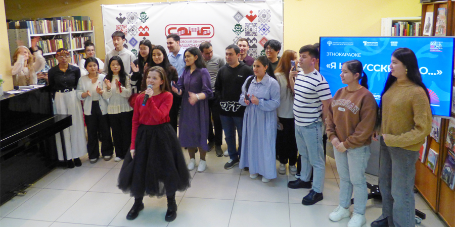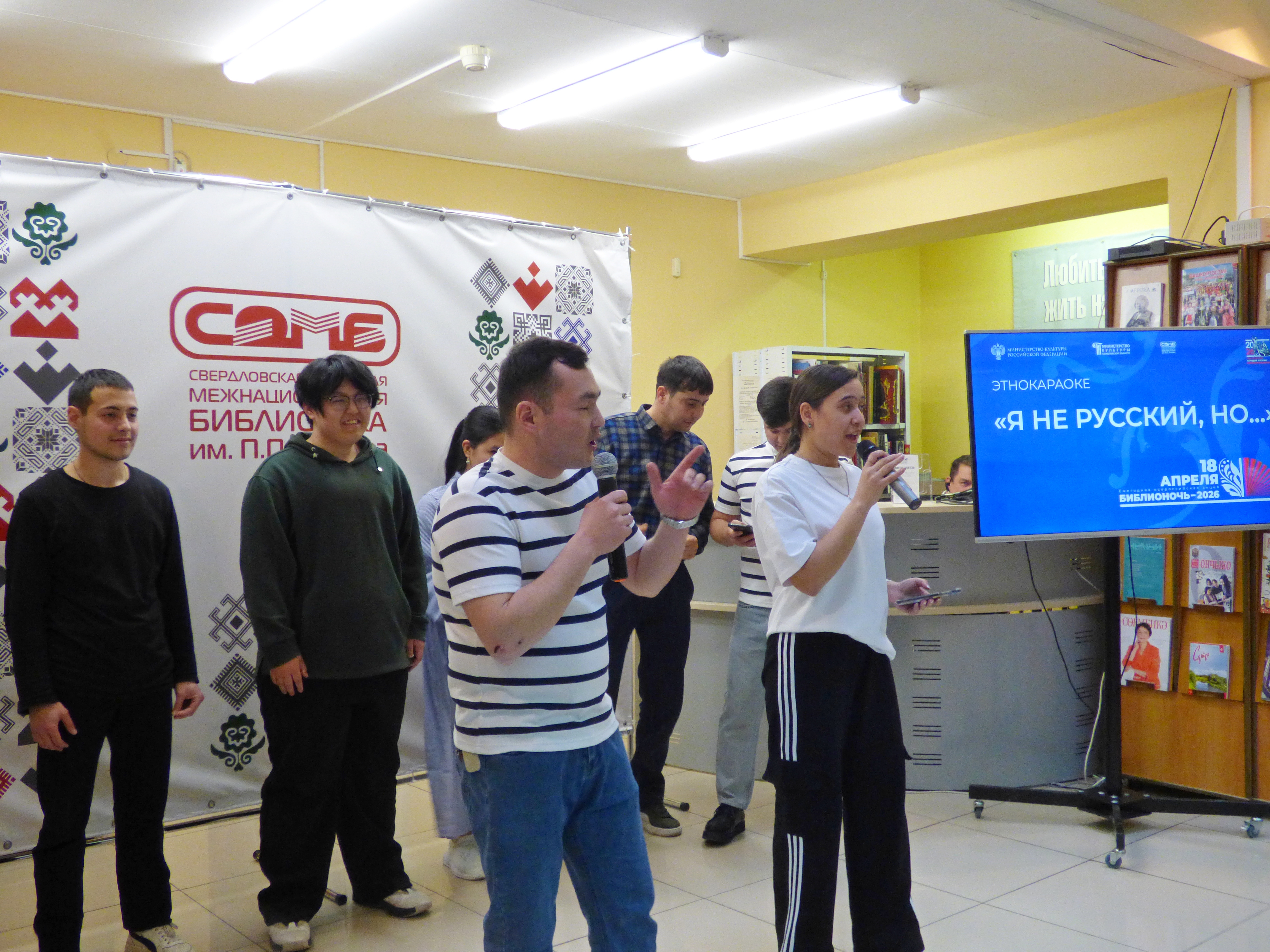 После торжественного открытия акции директором библиотеки Ольгой Ивановной Калининой эстафету приняло этнокараоке «Я не русский, но…». Это стало настоящим музыкальным экспериментом, основанном на интернет-тренде последнего года: иностранцы со всего мира записывают видео со словами «Я не русский, но…» - и поют наши хиты. На сцене библиотеки выступили иностранные студенты из стран Африки, Китая и Туркменистана, обучающиеся в екатеринбургских вузах - Уральском федеральном университет имени первого президента России Б. Н. Ельцина и Уральском государственном экономическом университете. Они исполнили знакомые каждому из присутствующих русские песни, демонстрируя не только владение языком, но и искреннюю любовь к русской культуре. Зал дружно подпевал, подтверждая, что музыка не знает языковых барьеров.