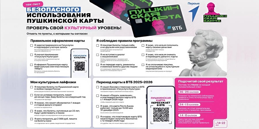 Общероссийское общественно-государственное движение детей и молодежи «Движение первых» в рамках проведения десятилетия детства в Российской Федерации подготовило памятку для проверки знаний по безопасному использованию карты программы «Пушкинская карта».