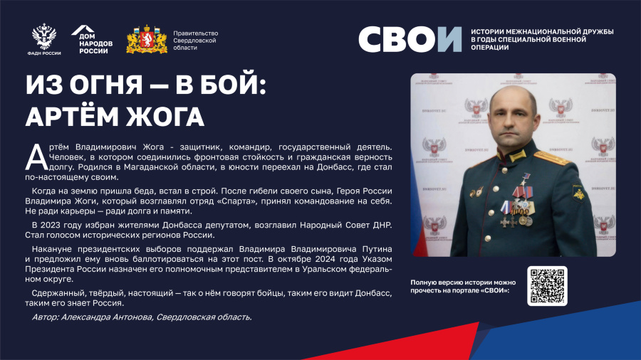 Департаментом внутренней политики Свердловской области во взаимодействии с ФБУ «Дом народов России» создана межрегиональная патриотическая выставка «СВОИ» (далее – выставка), в которую вошли 20 историй о героях Великой Отечественной войны и специальной военной операции.