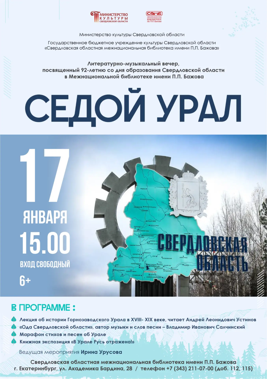 17 января в 15:00 в Межнациональной библиотеке имени П.П. Бажова состоится литературно-музыкальное событие под названием «Седой Урал».